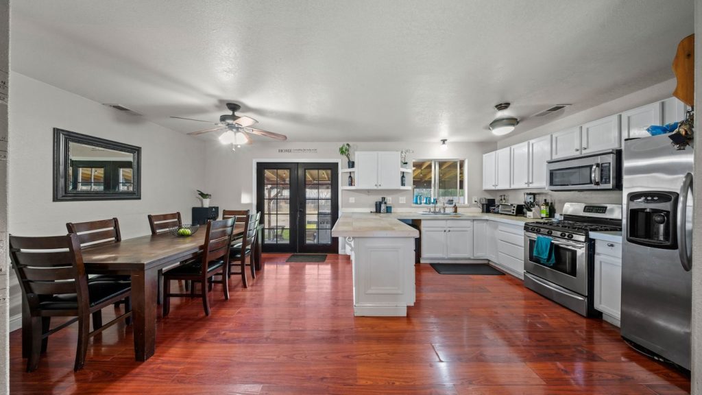 Inside, the kitchen is equipped with stainless steel appliances, a breakfast bar, and a dedicated dining area ready for weeknight meals or weekend gatherings. The primary bedroom features French doors opening directly to the backyard patio—an effortless flow that’s tailor-made for peaceful evenings and adds exciting potential for a future hot tub setup.